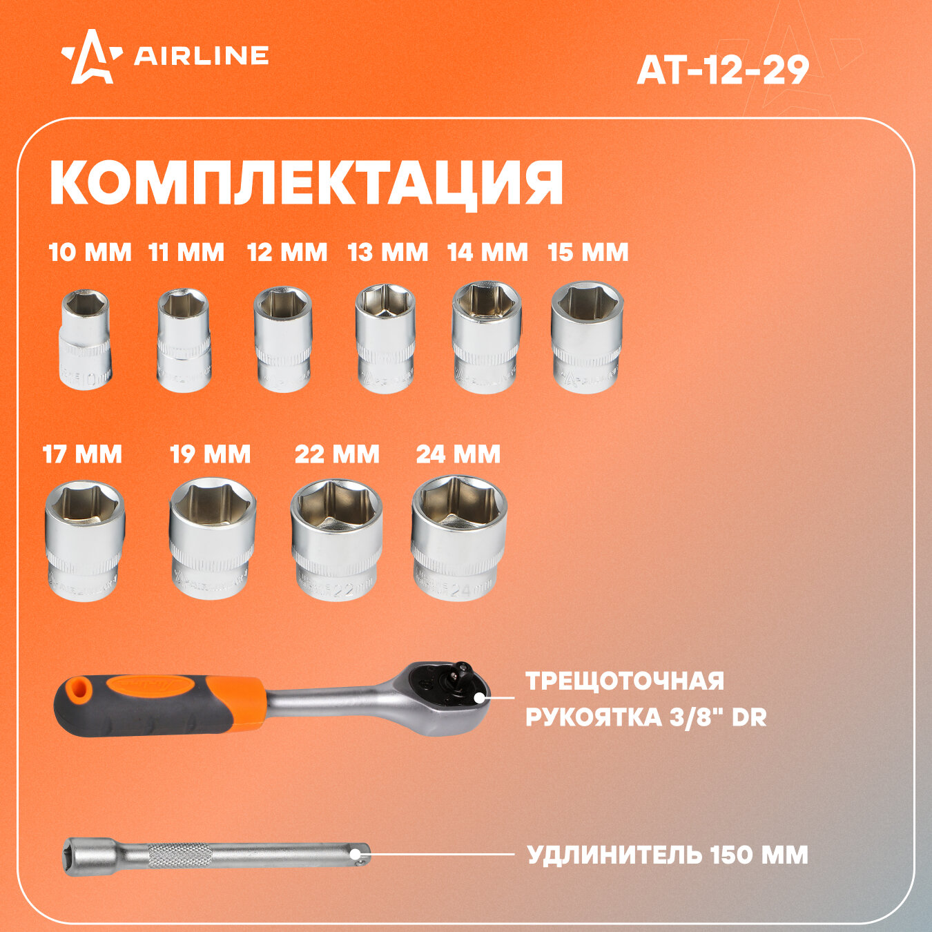 10 цен на Набор головок с трещоткой 3/8" DR 72Т 12пр. (10,11,12,13,14,15,17,19,22,24мм, удлинитель 150мм) AT-12-29 AIRLINE