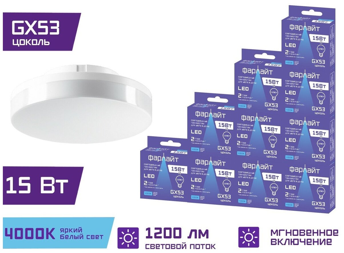 Лампочка светодиодная GX53 / яркий белый свет / 15 Вт / 4000 К / GX53 Фарлайт / Комплект 10 шт. информация: