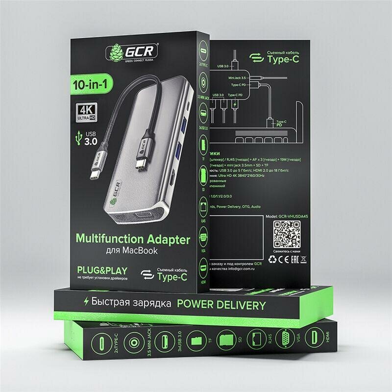 Переходник Greenconnect GCR TypeC Hub 10 в 1 HDMI + VGA + RJ45 + USB3.0 x3 + Card Reader + Audio + TypeC PD