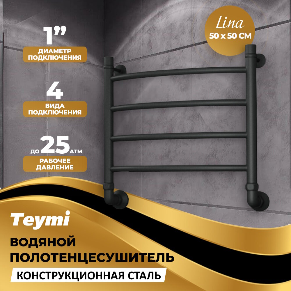 Полотенцесушитель водяной Teymi Lina П4 50х50, наружняя резьба 1", в максимальной комплектации К3, черный матовый информация: