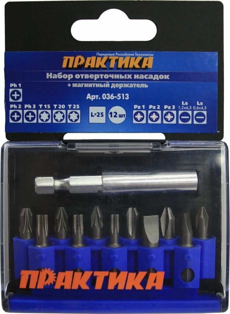 Практика Набор бит 12 шт PH 3шт,PZ 3шт+SL2шт+Torx3шт+магндерж 036-513 .
