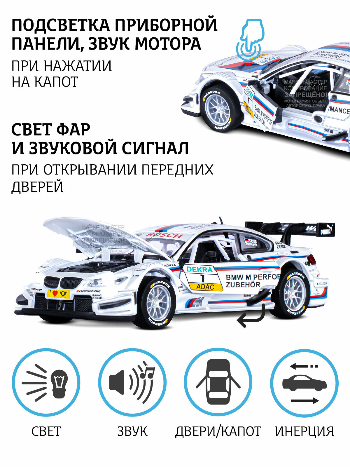 Машина металлическая BMW M3 DTM 1:32, инерция, световые и звуковые эффекты, открываются двери, цвет .