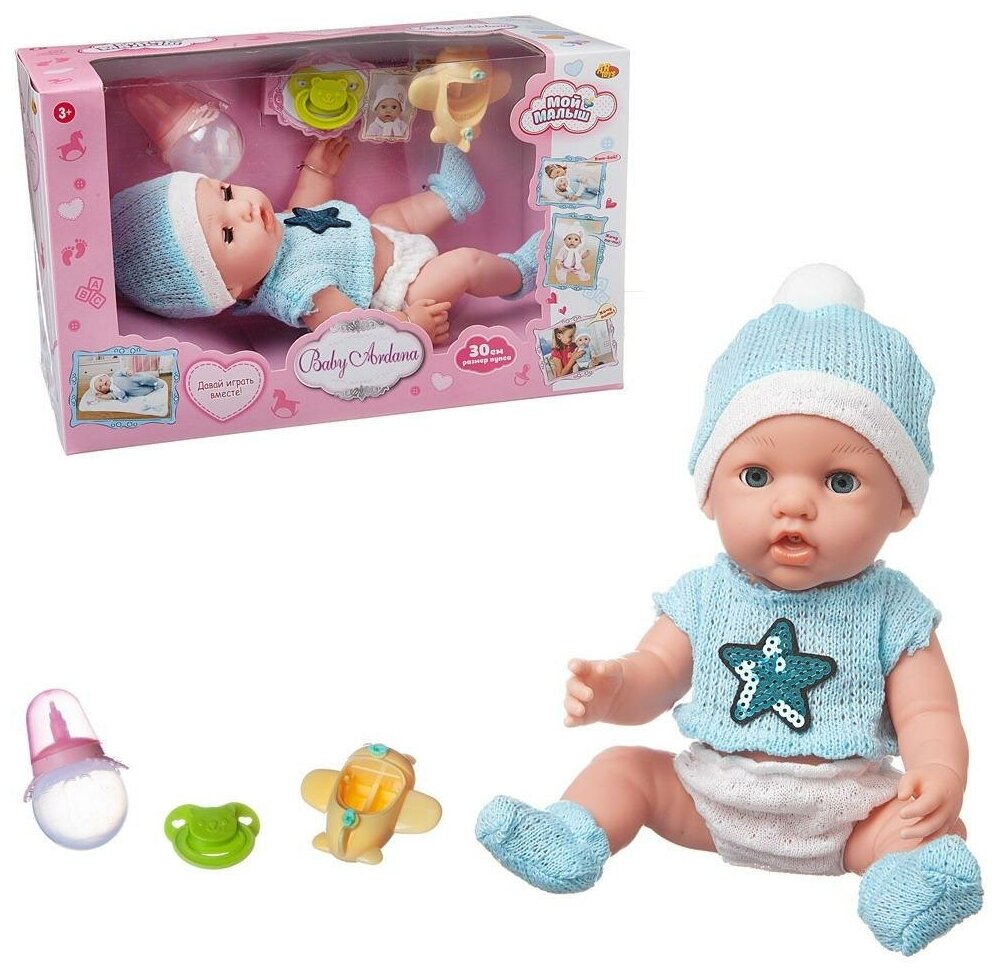 Отзывы на Пупс ABtoys Baby Ardana 30см, в кофточке с пайетками, трусиках, шапочке и носочках, в наборе с аксессуарами, в коробке PT-01417
