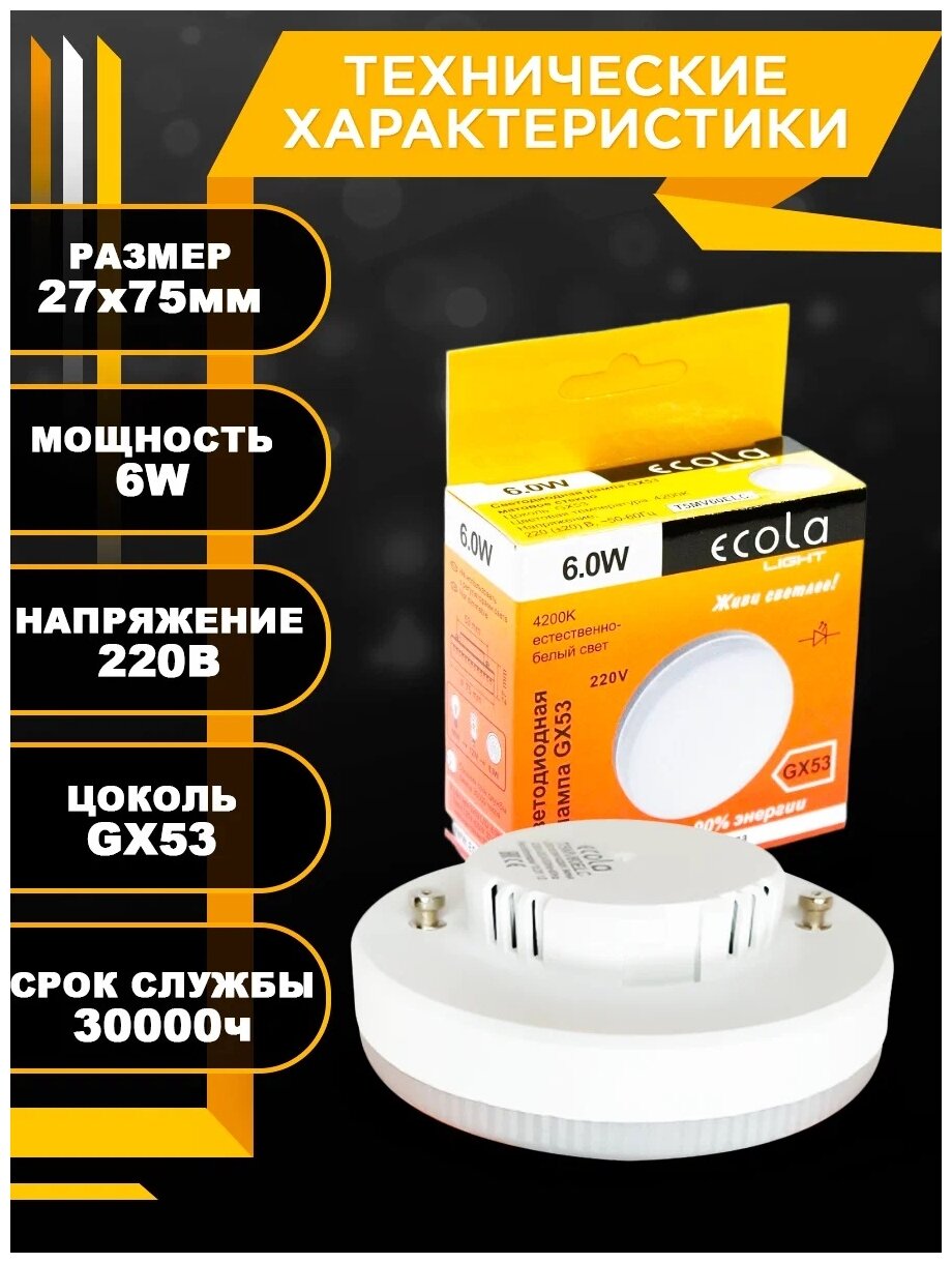 Упаковка светодиодных ламп 2 шт. Ecola GX53 6Вт 4200 K нейтральный дневной белый свет, таблетка led, T5MV60ELC, матовая информация:
