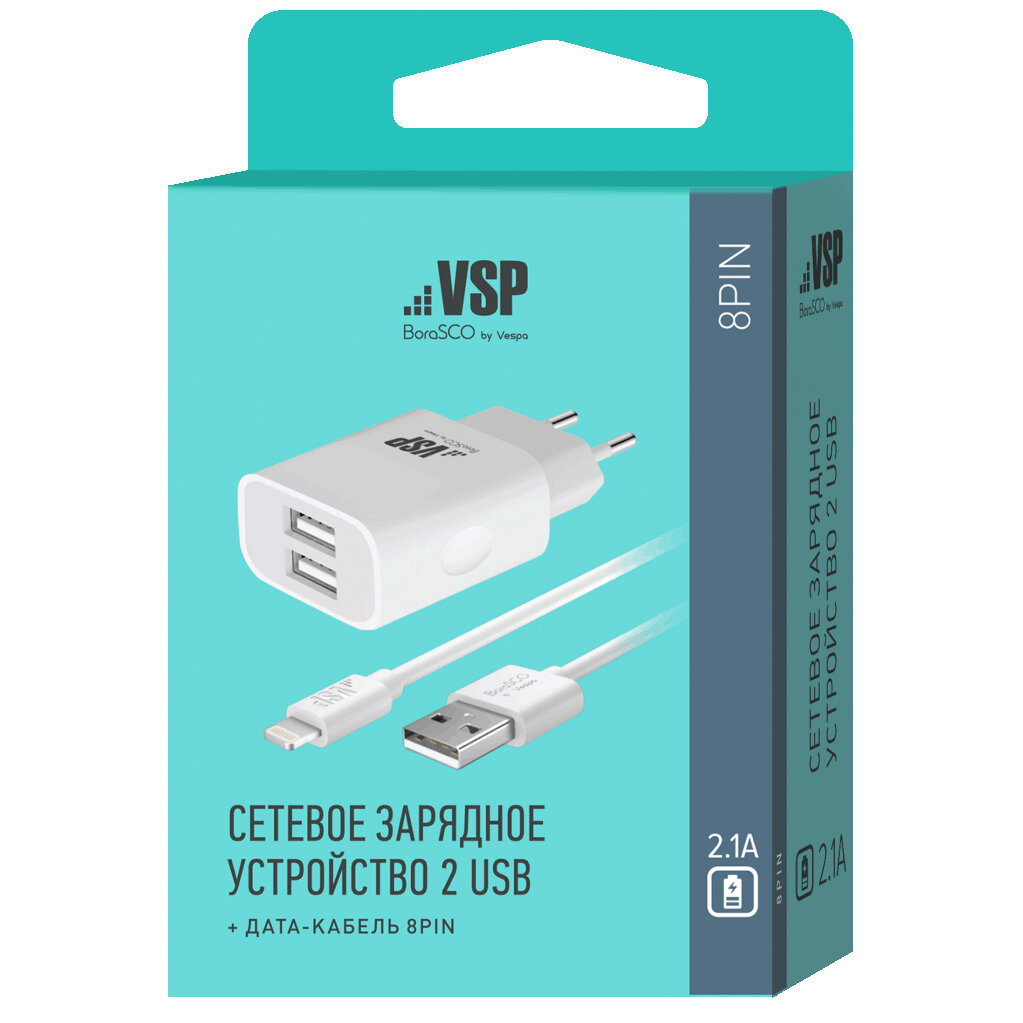 Сетевое зарядное устройство BoraSCO 2USB 2.1A 8pin белое информация: