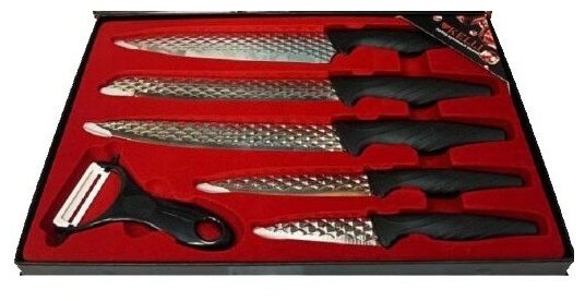 | Комплектация | Высококачественная сталь. Нож поварской, Нож хлебный, Нож для резки, Нож универсальный, Нож овощной, Овощечистка. |