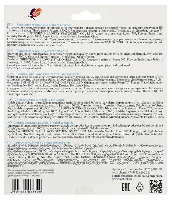 Карандаши цветные акварельные (ЛУЧ) 24 цвета Классика цвета с кистью арт.32С 2092-08 информация: