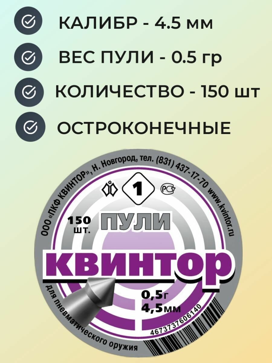 Пули для пневматики 4,5мм Квинтор 1 остроконечные 150 шт, пули 0,5 гр для пневмата, винтовки информация: