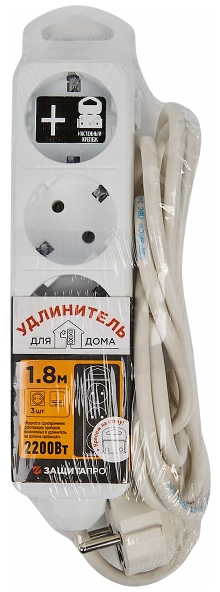 Удлинитель бытовой Защита Про 3 розетки с заземлением 3х0.75 мм 1.8 м 2200 Вт цвет белый информация: