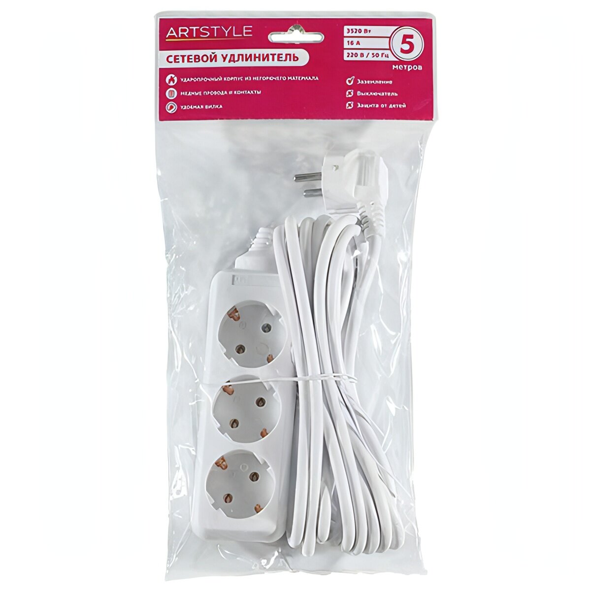 Сетевой удлинитель,CL-C35GW, ARTSTYLE, белый, 3 гн., 5м, с/заз., б/выкл., цена за 1 шт.