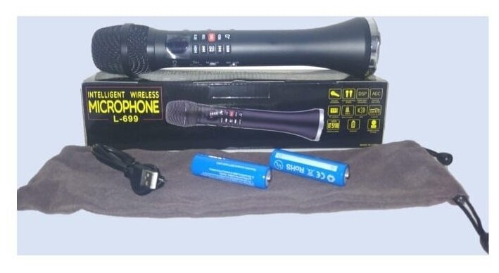 | Подробная комплектация | - Караоке микрофон L699 - 20 W, Зарядный кабель USB/microUSB , два съемных аккумуляторах по 2000mAH, велюровый мешочек для переноски |