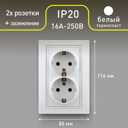 Розетка Intro Plano 1-205-01 с заземлением двойная 2X2P+E Schuko, 16А-250В, IP20, СУ, белый информация:
