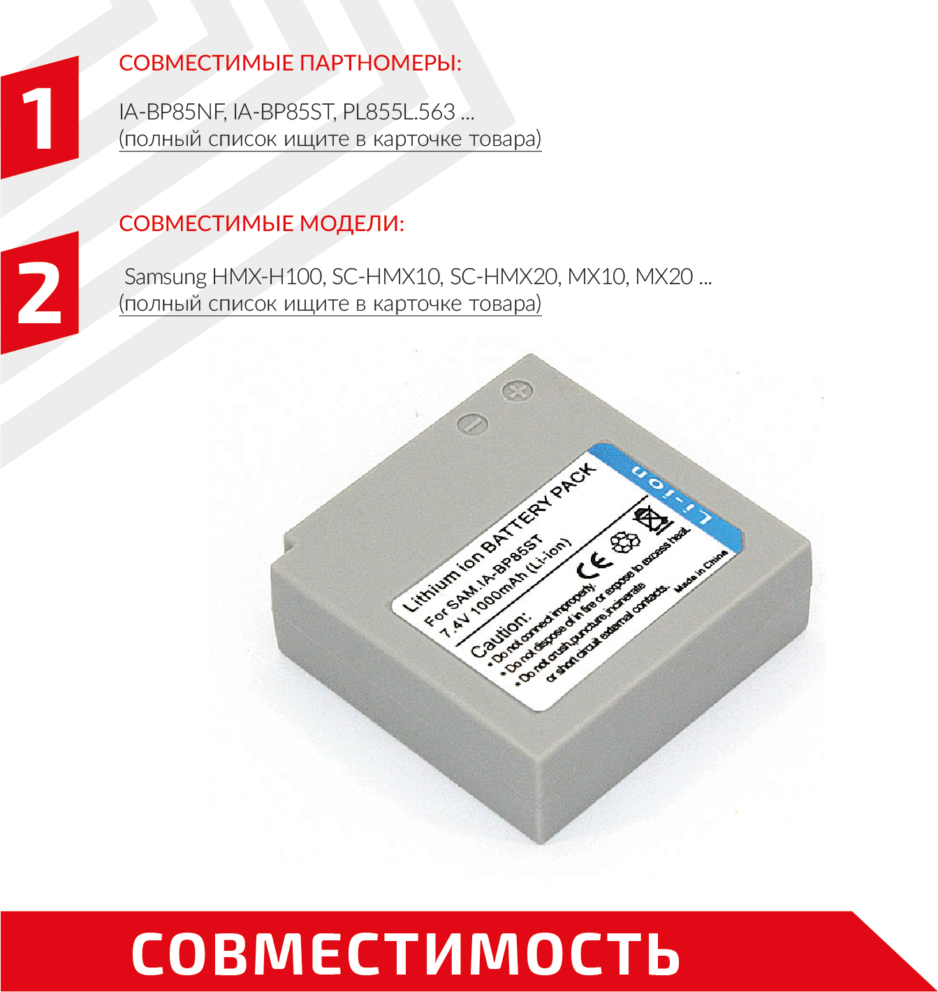 Аккумуляторная батарея для фотоаппарата Samsung HMX-H100 (IA-BP85ST) 7,4V 1000mAh информация: