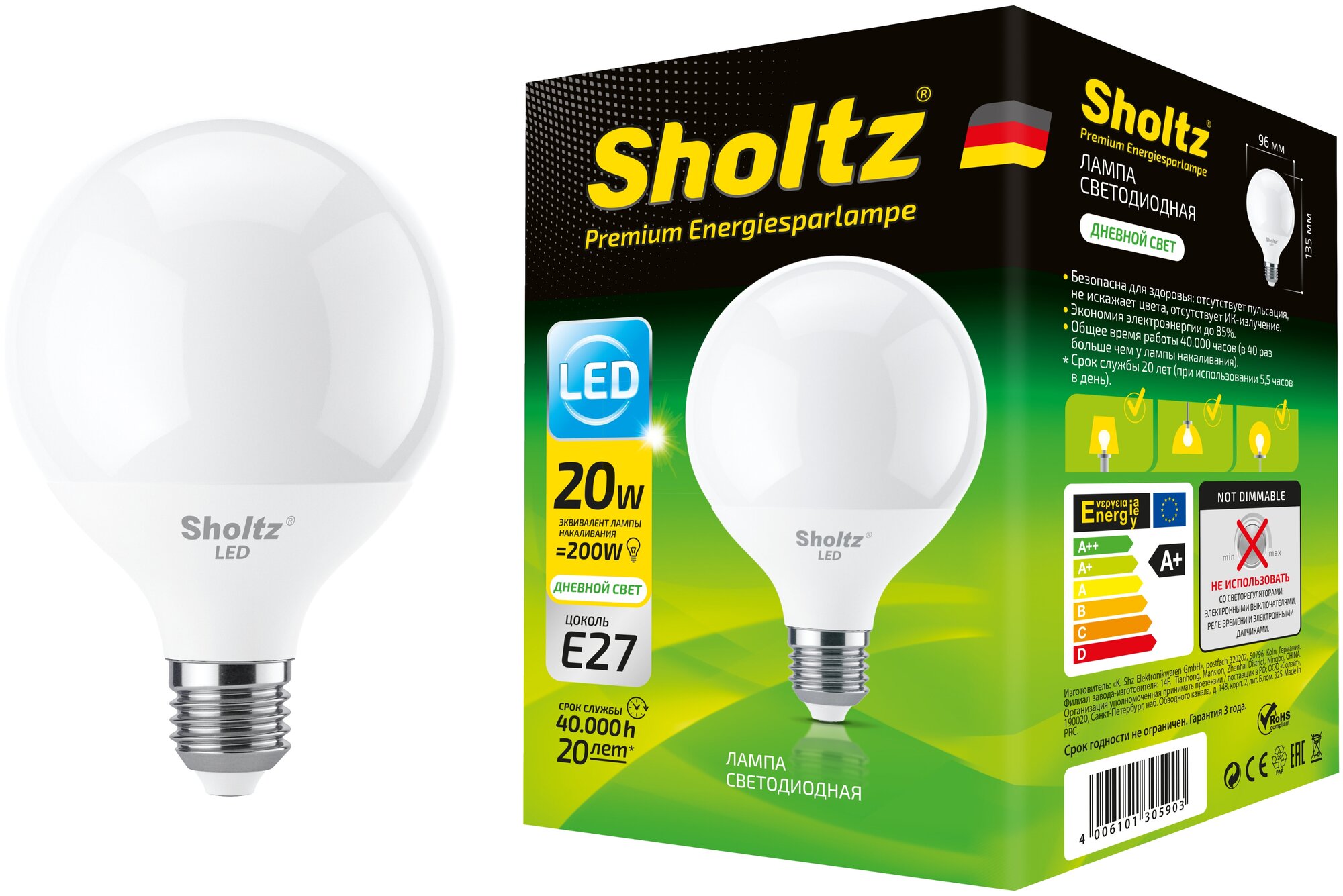 Лампа светодиодная Sholtz 20Вт 220В G95 E27 4200К информация: