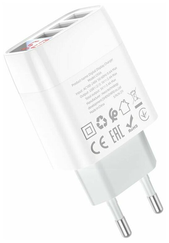 Сетевое зарядное устройство HOCO C93A Easy Charge 3xUSB, 3.4А, LED дисплей (белый) информация: