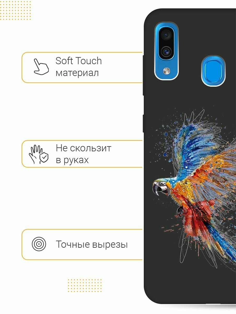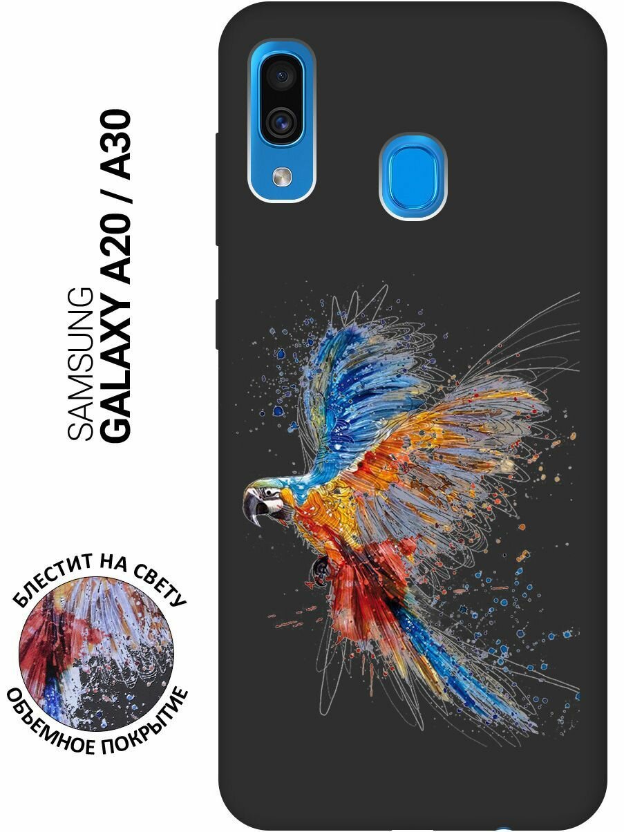 Матовый Soft Touch силиконовый чехол на Samsung Galaxy A20 / A30 / Самсунг А20 / А30 с 3D принтом "Colorful Parrot" черный информация: