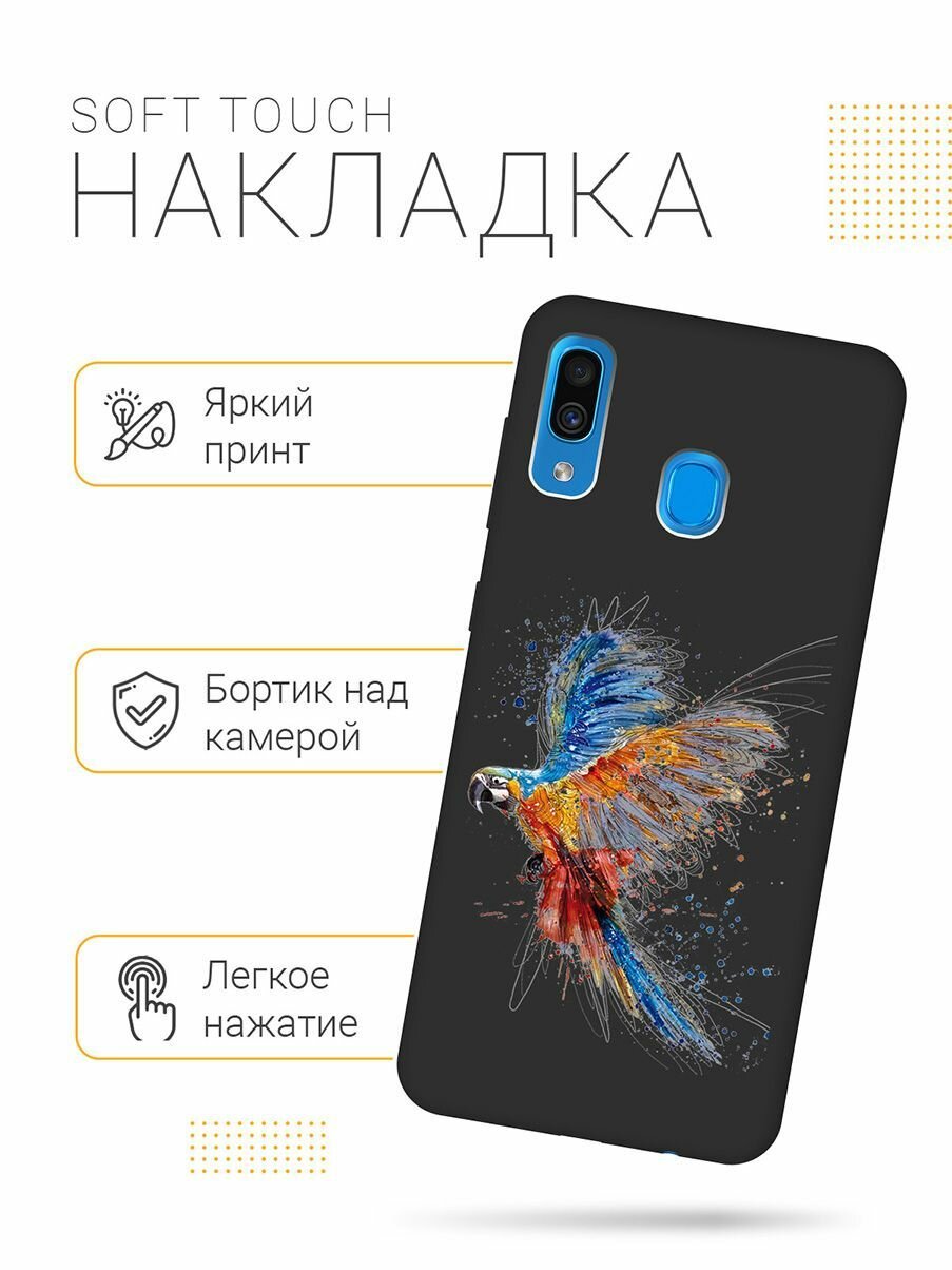 Отзывы на Матовый Soft Touch силиконовый чехол на Samsung Galaxy A20 / A30 / Самсунг А20 / А30 с 3D принтом "Colorful Parrot" черный