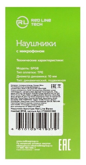 Наушники Red Line Stereo Headset SP08 вакуумные микрофон проводные 1.2 м черные информация: