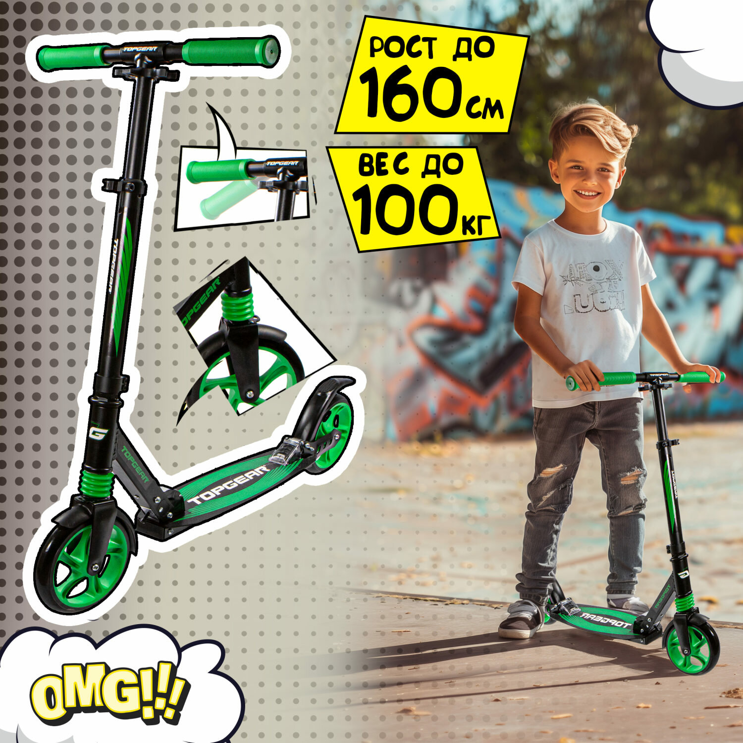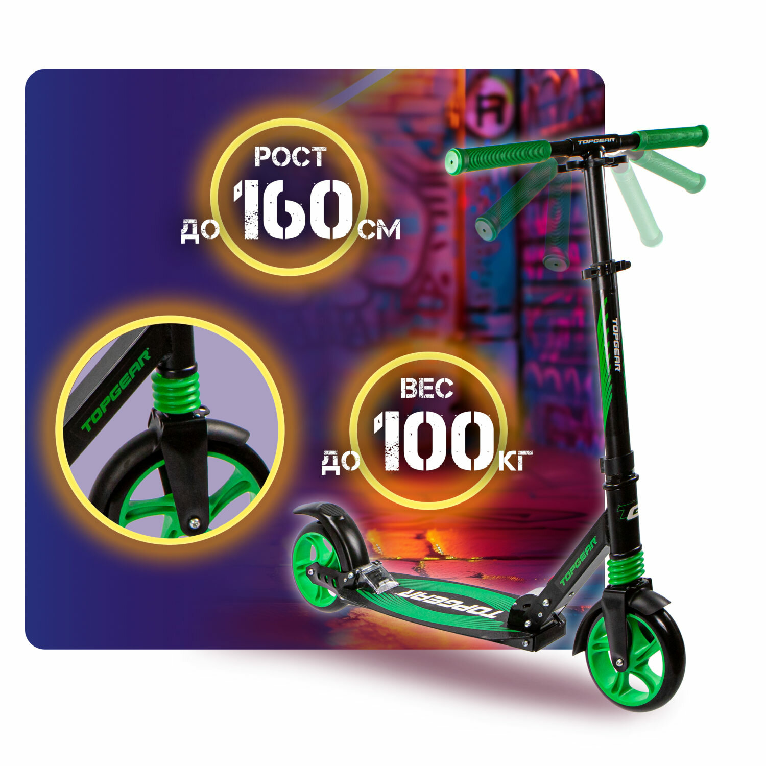 Отзывы на Самокат TOPGEAR 2-х кол.,алюм.,кол PU 200мм,передн.и задн.аморт.,ручки складн.TPR,96х13х92(76)см,г/п до 100кг,черн.-зел.