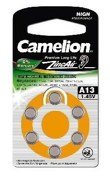 Батарейка для слуховых аппаратов Camelion ZA13 BL-6 Mercury Free A13-BP6 0%Hg, 1.4V, 280mAh 12824 15905227 информация: