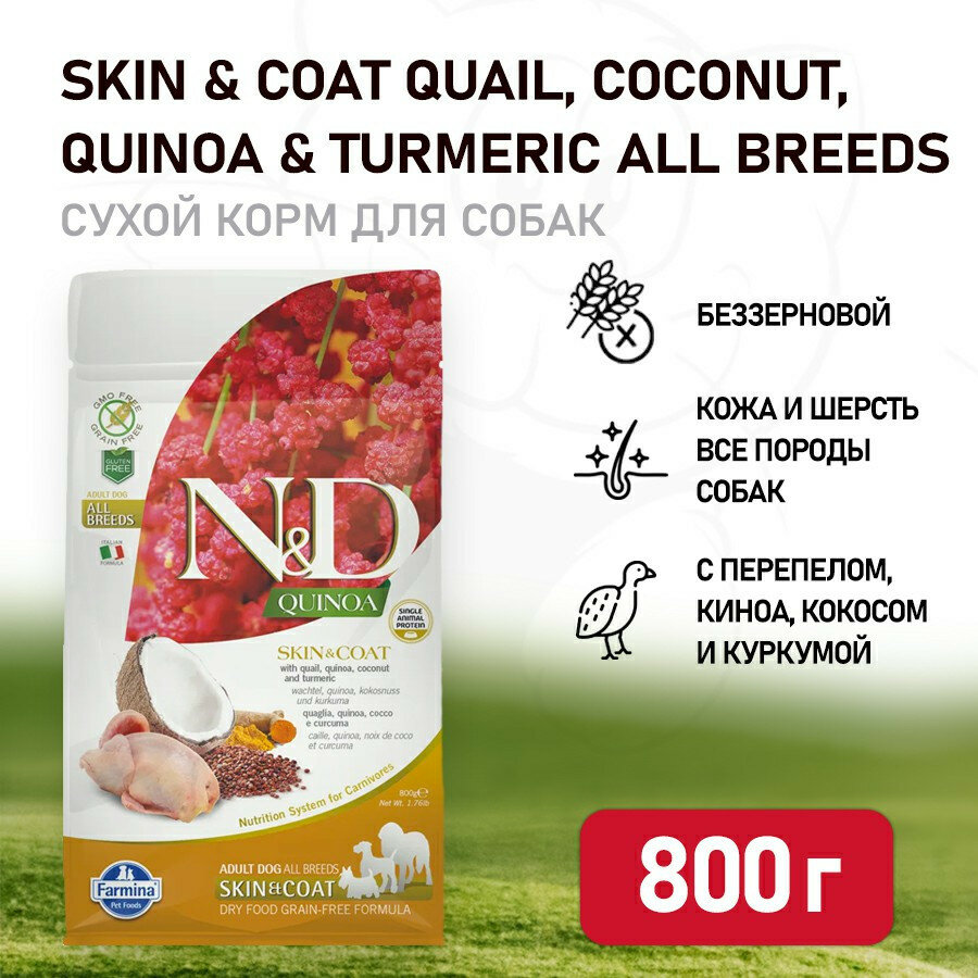 Сухой корм для собак Farmina N&D, беззерновой, для здоровья кожи и шерсти, перепелка, с киноа 800 г информация: