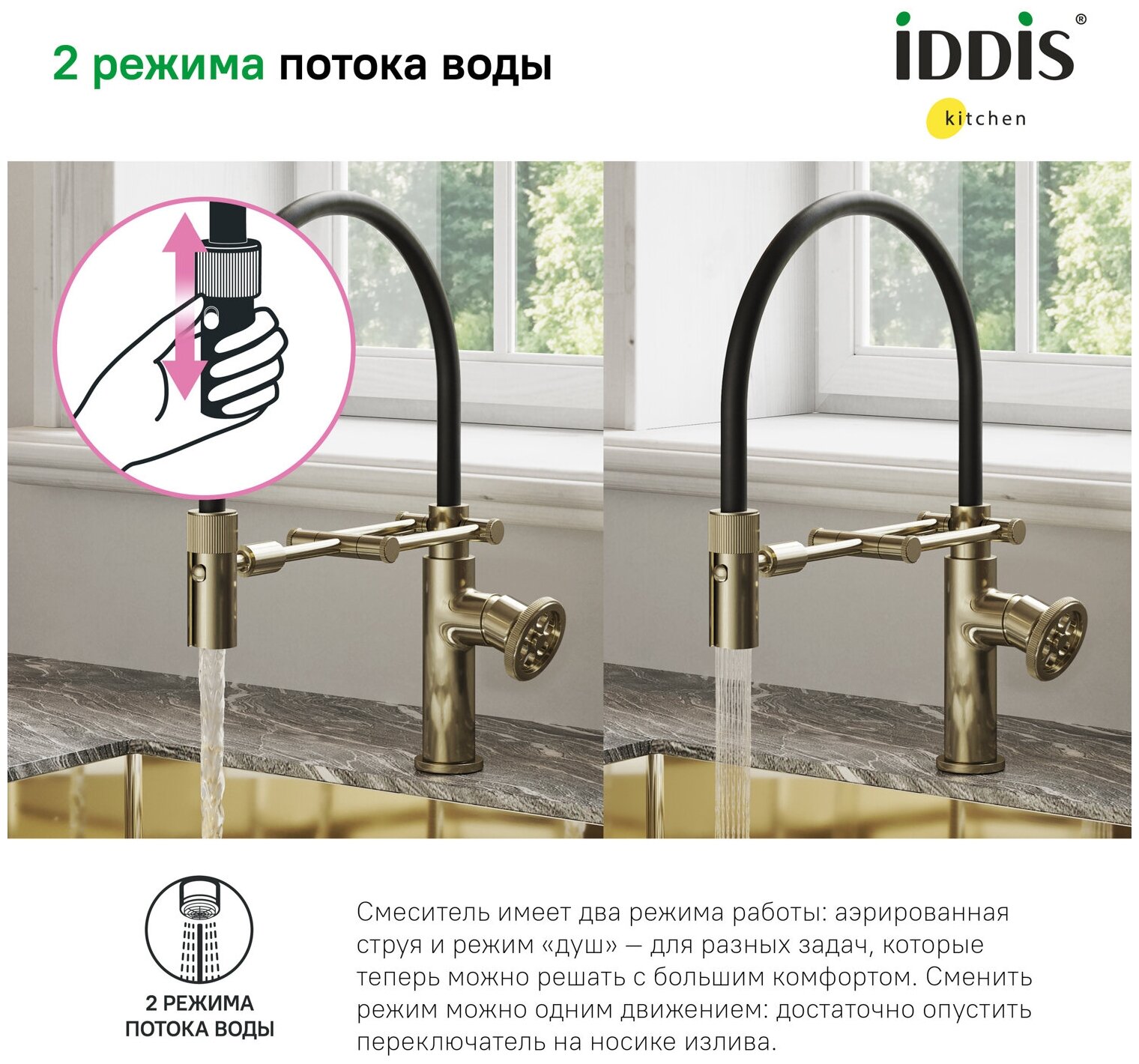Смеситель для кухни с гибким изливом, матовое золото, Grange, IDDIS, GRAMGFLi05