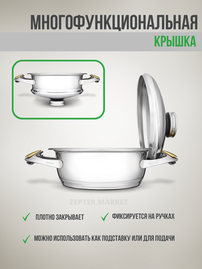 | Комплектация | * Z-2020 - Сотейник 2.0 л, Ø20 см * Z-2042 - Кастрюля 4.2 л, Ø20 см * Z-2050 - Кастрюля 5 л, Ø20 см * Z-CB20 – Миска, 2 л, Ø20 см с пластиковой крышкой * Z-S20 - Пароварка, 2.8 л, Ø20 см * Z-2AC – Терка, ручка-держатель * Z-SK – Ручка-присоска *Z-420-18C - Корзинка-пароварка 2 л. 18 см |