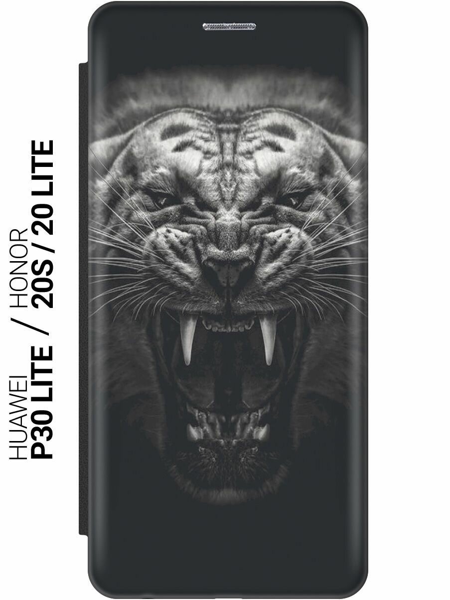 Чехол-книжка на Honor 20 Lite, 20s, Huawei P30 Lite, Хуавей П30 Лайт, Хонор 20 Лайт, 20s c принтом "Оскал тигра" черный 807 ₽