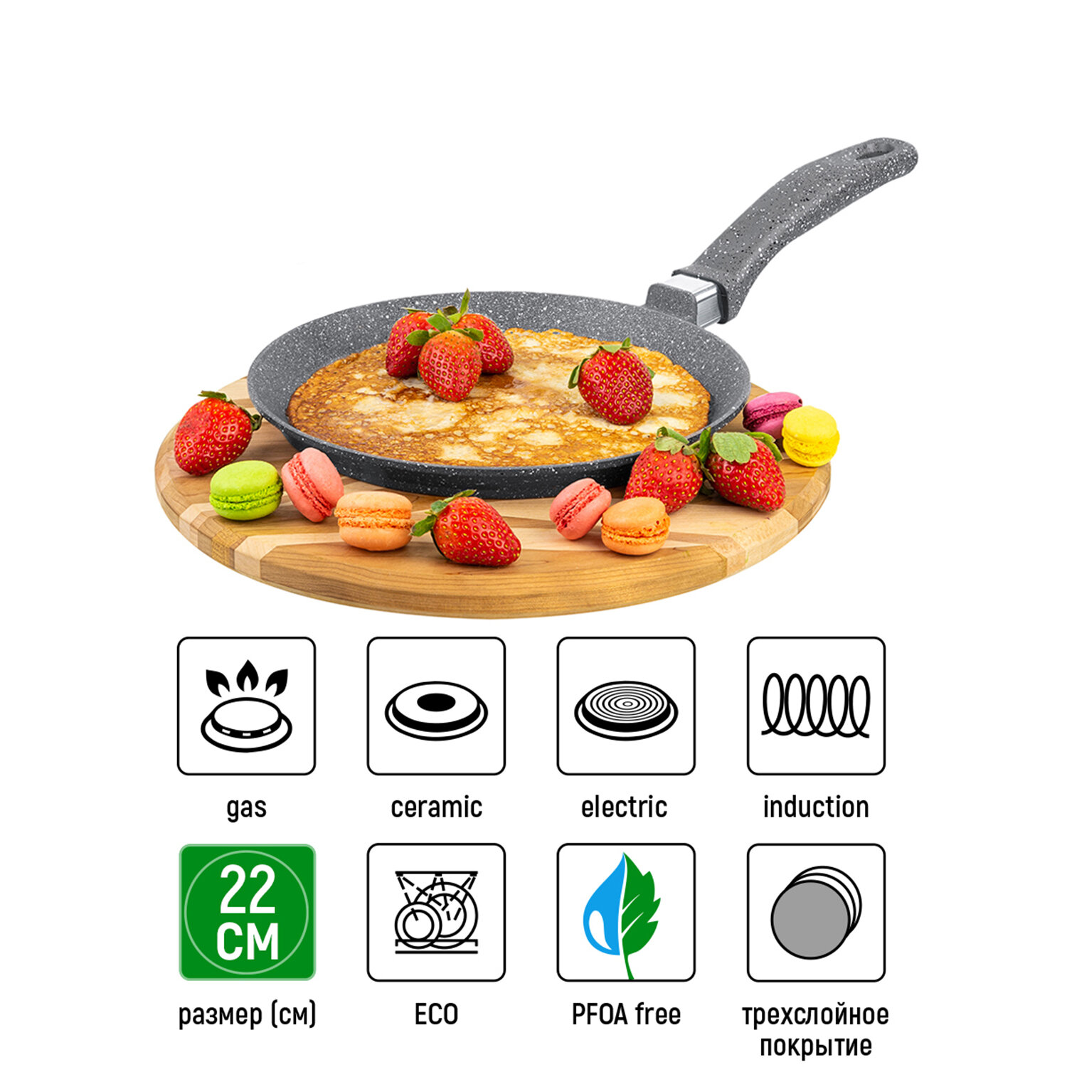 | Дополнительная информация | Сковорода блинная 22 см ГАРМОНИЯ ВКУСА "Серый мрамор" ИНДУКЦИЯ 43*23*6,5 см, ручка - 20 см, высота сковороды 2 см, диаметр дна - 20 см, диаметр индукционного дна 18 см, 3-х слойное антипригарное покрытие - Duramax, литая, подходит для использования на всех видах плит, в том числе на индукционных |