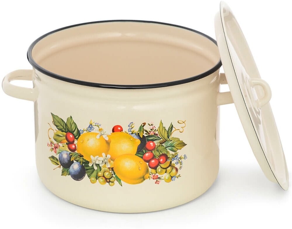 Кастрюля эмалированная 1,5 л с ободком белая с рисунком Фруктовая фантазия