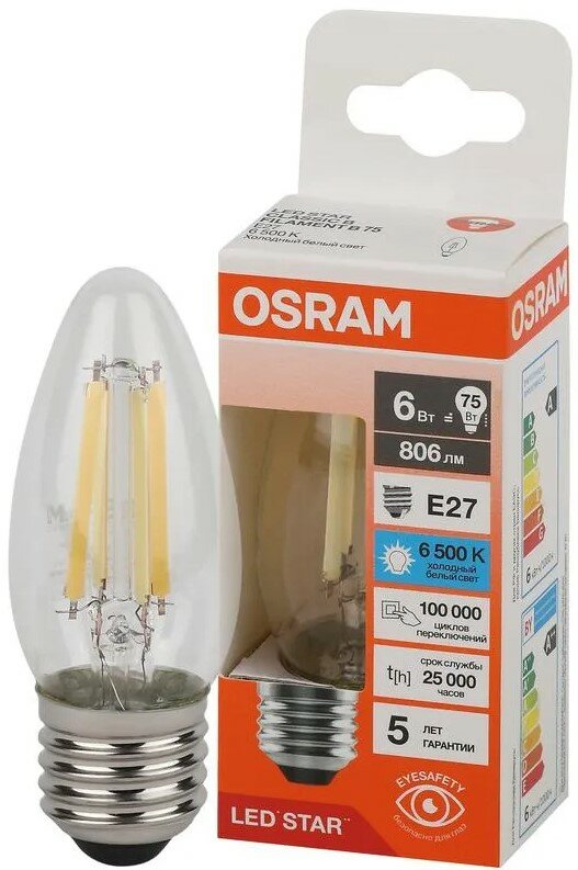 Отзывы на Лампочка светодиодная Osram филаментная стекло Свеча B E27 6Вт 220В 806Лм 6500К Холодный белый, упаковка 10шт