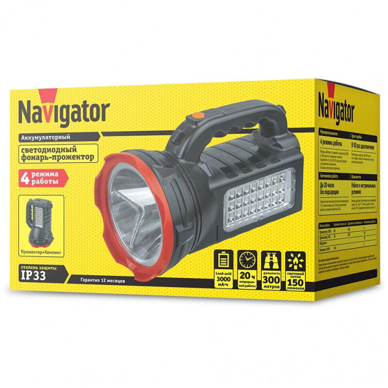 Фонарь Navigator 14 672 NPT-SP27-ACCU прожектор 1LED,3Вт+24LED,3Вт,акк.4,4В 3Ач информация: