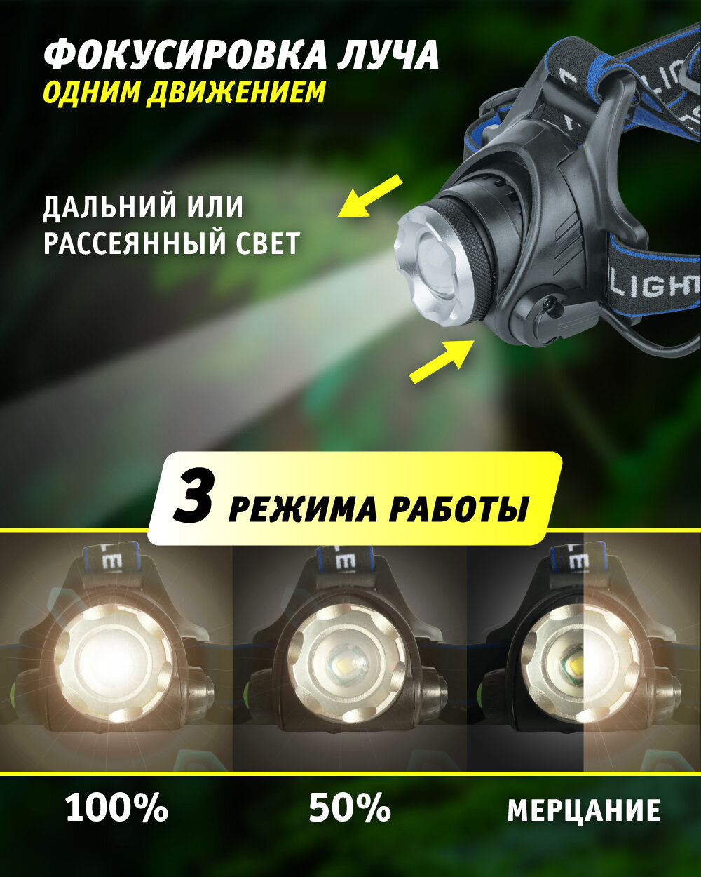 Налобный фонарь аккумуляторный, мощный светодиодный 18650