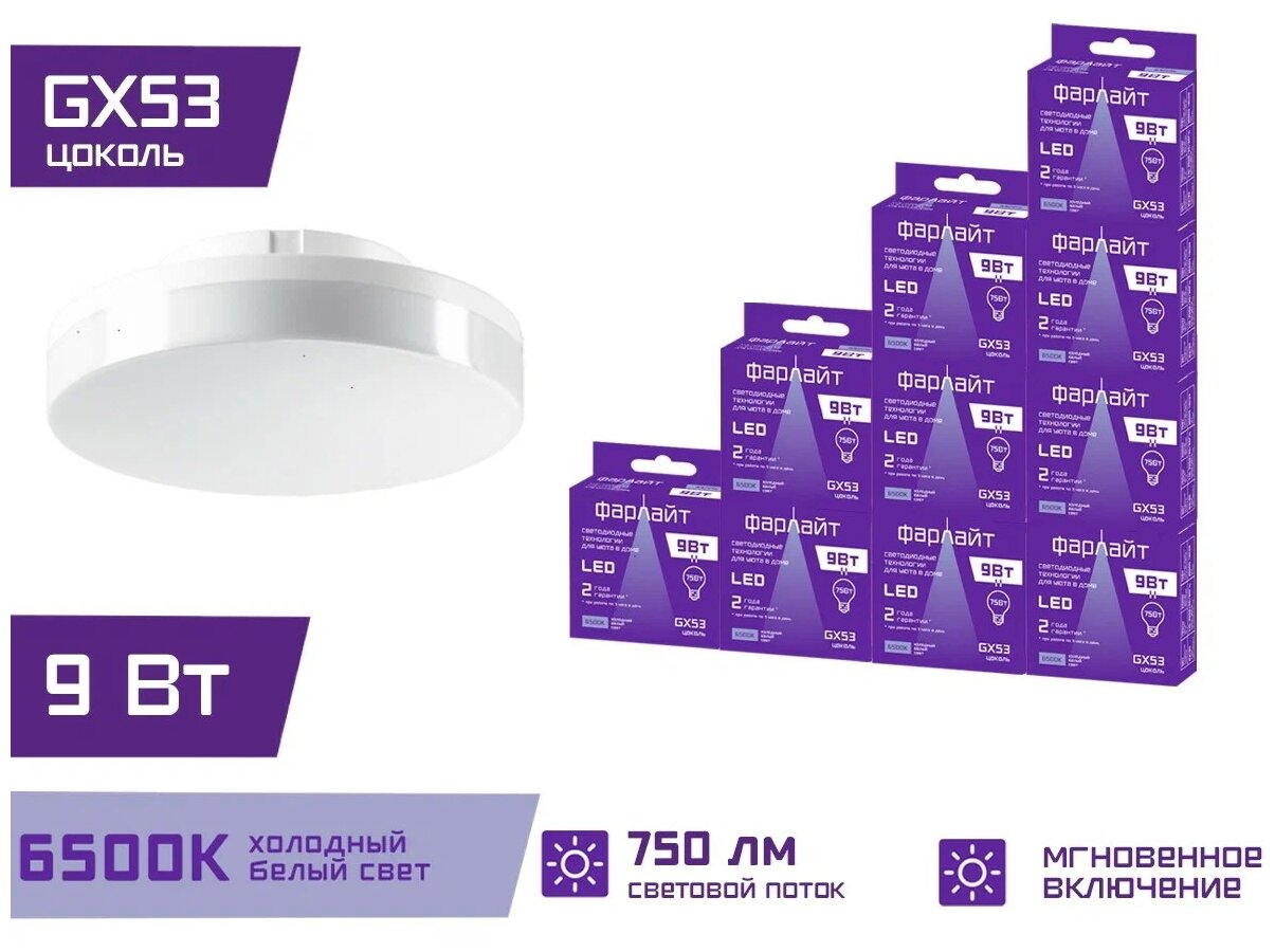 Лампочка светодиодная GX53 9 Вт 6500 К GX53 Фарлайт / Комплект 10 шт. информация: