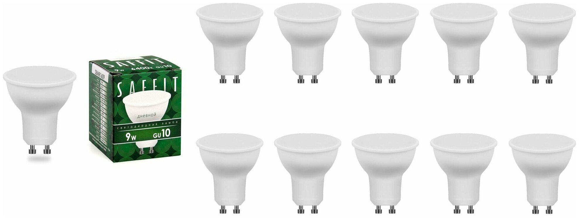 10 цен на Лампочка светодиодная Saffit 9W=90W 230V GU10 Рефлектор PAR16 810Лм Ra>80 угол 120° 6400К, упаковка 10шт.