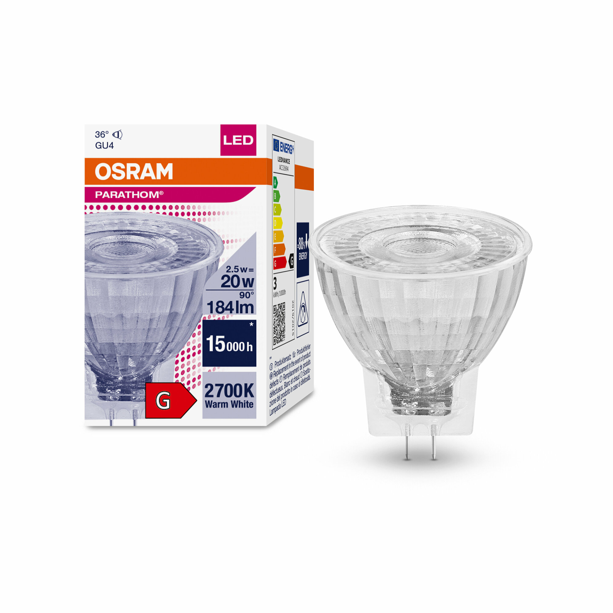 Лампа светодиодная OSRAM 2,5W=20W 12V Софит MR11 GU4 PARATHOM стекло, угол 36° 184Лм 2700К Теплый белый, уп. 5шт 2 403 ₽