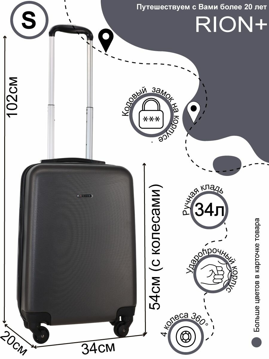 Чемодан Рион+ (RION+) R435, Пластик, 55 см, 38 литра, 4 колеса, S (до 55 см), ручная кладь, темно-серый информация: