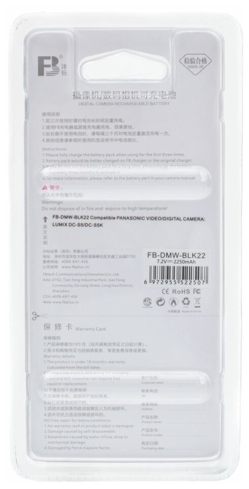 Аккумулятор FB BLK22 для Lumix DC-S5 S5K информация:
