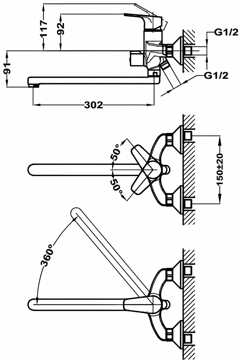 Смеситель на раковину настенный Эверест B46-350 с круглым поворотным изливом, кран-буксы 1/2", хром