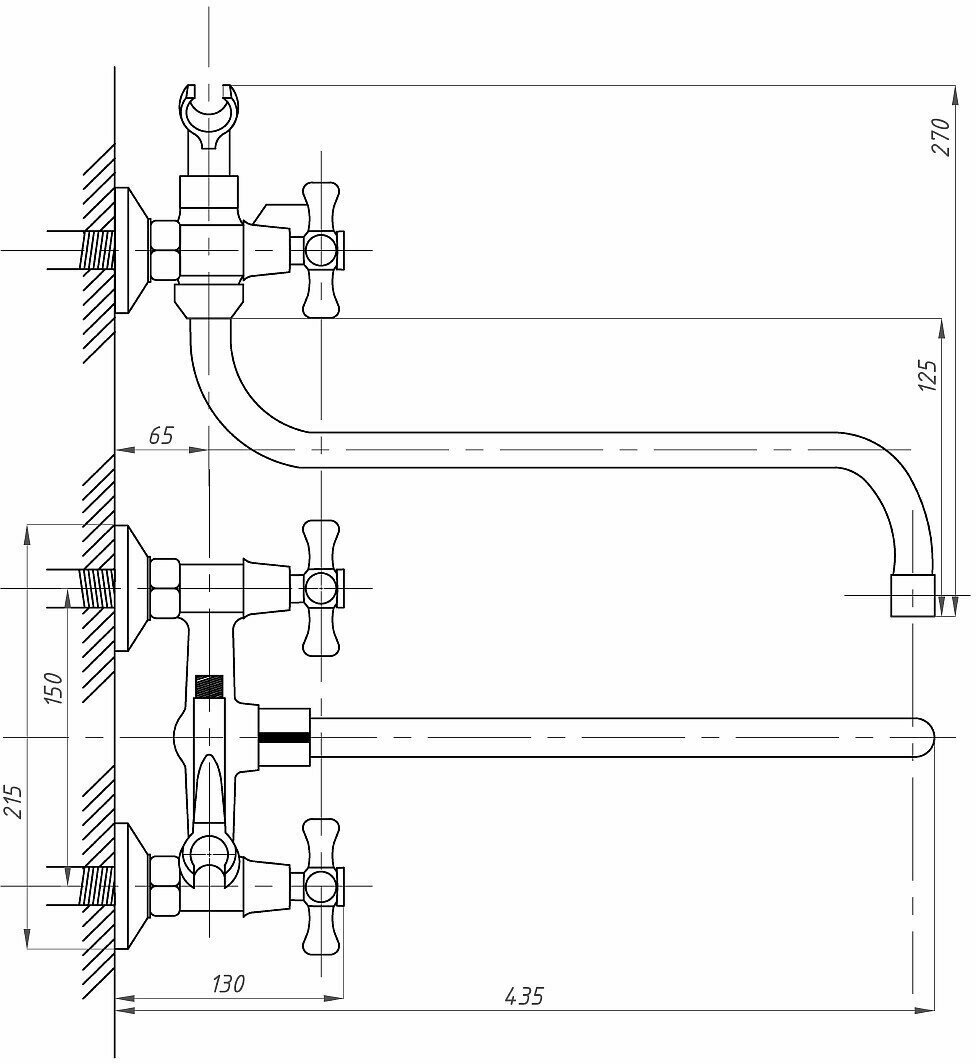 Смеситель на раковину настенный Эверест B46-350 с круглым поворотным изливом, кран-буксы 1/2", хром