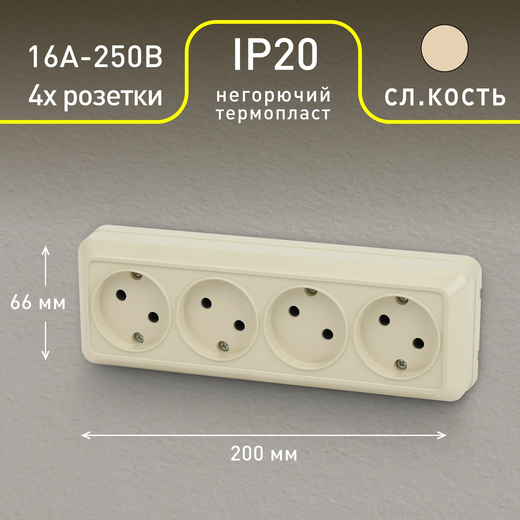 Розетка Intro Quadro 2-207-02 без заземления четырехместная 4х2P, 16А-250В, IP20, ОУ, слоновая кость информация: