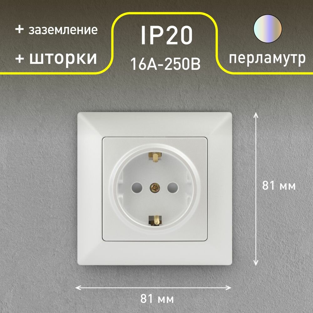 10 цен на Розетка Intro Solo 4-206-06 с заземлением 2P+E Schuko со шторками, 16А-250В, IP20, СУ, перламутр