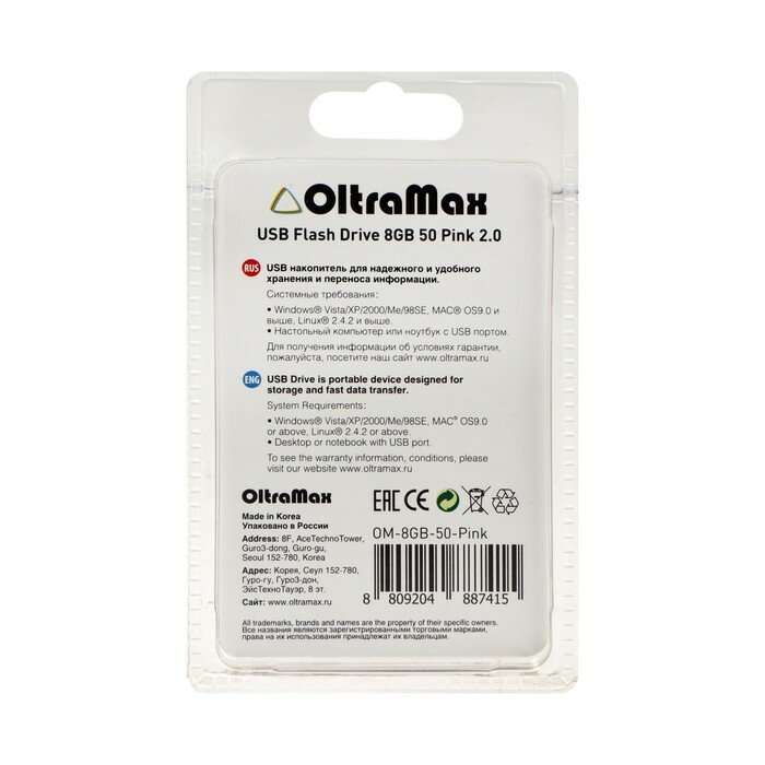 Флешка OltraMax 50, 8 Гб, USB2.0, чт до 15 Мб/с, зап до 8 Мб/с, розовая информация: