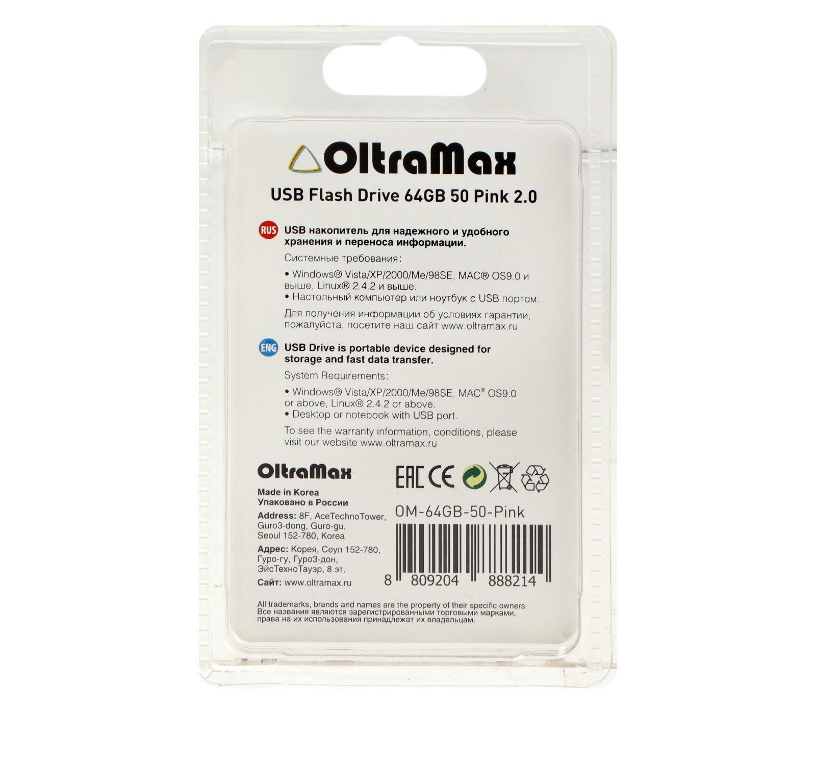 Флешка OltraMax 50, 64 Гб, USB2.0, чт до 15 Мб/с, зап до 8 Мб/с, розовая информация: