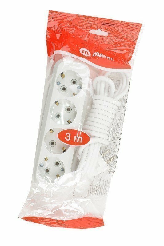 Удлинитель Makel длина 3 м розеток 4 гнезда с заземлением c/з Макел 3х1 ПВС электрический сетевой бытовой 3600 вт 220в белый, арт. MGP153