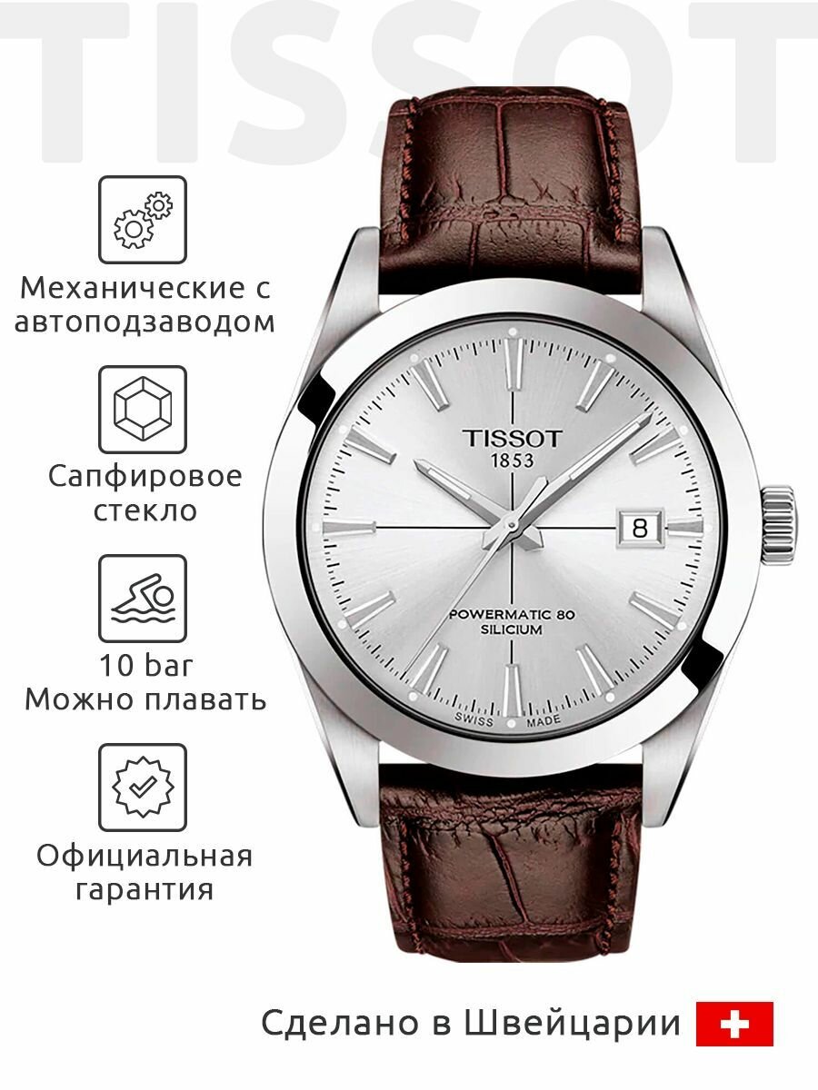 Швейцарские механические часы с автопозаводом Tissot Gentleman Powermatic 80 Silicium T127.407.11.041.00 на стальном браслете, с водозащитой 10 бар и международной гарантией от производителя