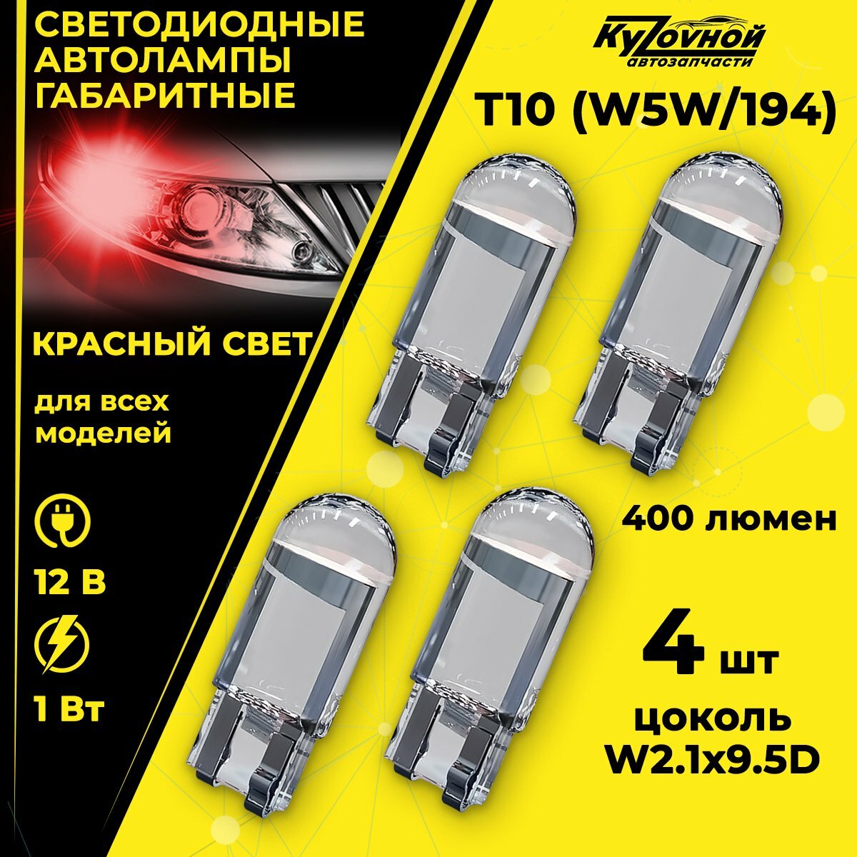 Лампа автомобильная светодиодная габаритная Т10 W5W/194, 4 шт в комплекте, цвет красный информация: