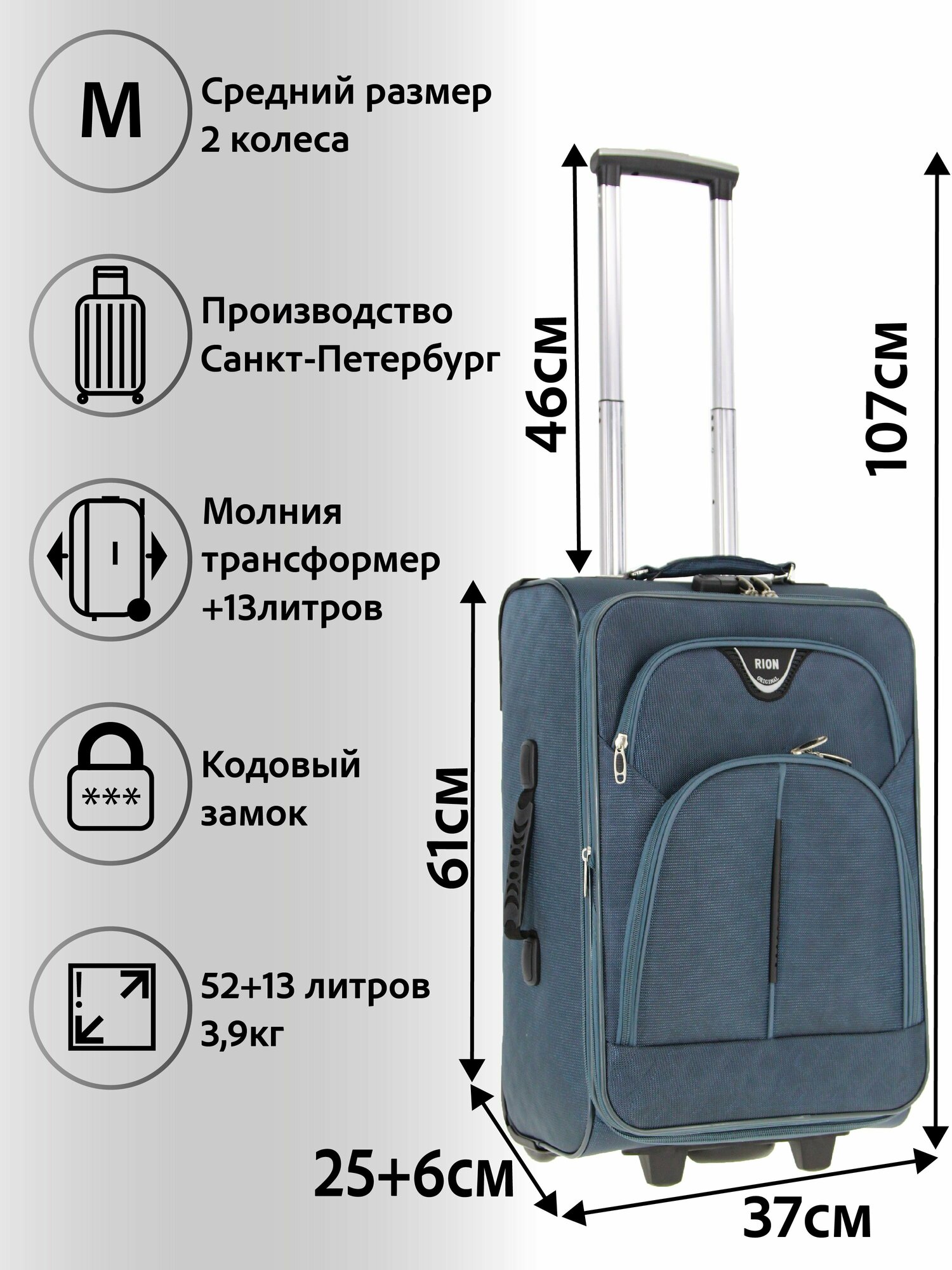 Чемодан Рион+ (RION+) R411, Ткань, 56 см, 52+15 литра, 2 колеса, M (56-70 см), усиленный до 25кг, синий 10 182 ₽
