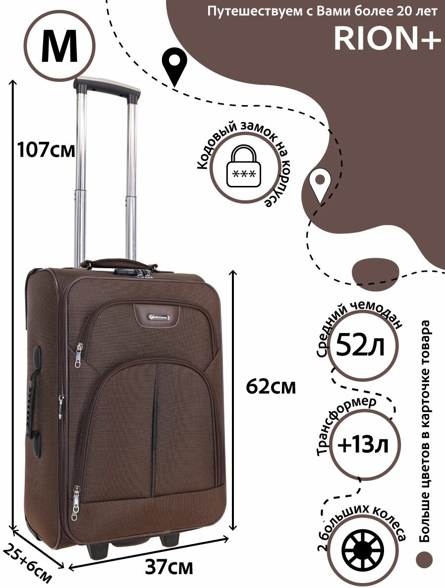 Чемодан Рион+ (RION+) R411, Ткань, 56 см, 52+15 литра, 2 колеса, M (56-70 см), усиленный до 25кг, коричневый информация: