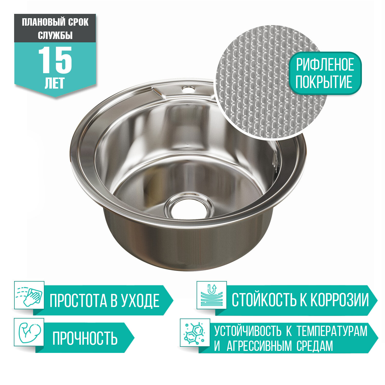 Врезная кухонная мойка Mixline из нержавеющей стали рифленая круглая d 49 см выпуск 3 1/2 глубина 18 см